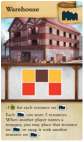 You can store up to 3 resources with a Warehouse by physically placing the cubes on the building. When another player names a resource that you do not want, place the resource on your Warehouse. You may remove a resource from your Warehouse and place it in an empty square on your board when you do this. You can never remove a resource without placing a new resource on the Warehouse. As a result, the number of resources on a Warehouse will never decrease.