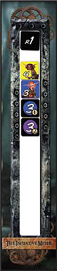 In battle, a single turn from each Baddie and Gearloc makes up 1 full round. The Ini Meter tracks the current round and whose turn it is. It also gives you a visual forecast of who will be attacking next and in what order. Initiative is built downward on the meter from highest (going first) to lowest (going last).