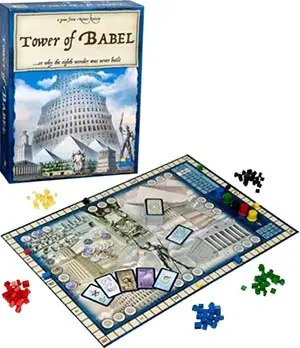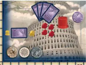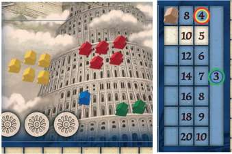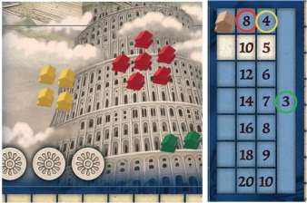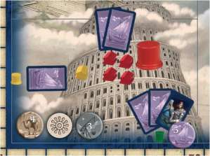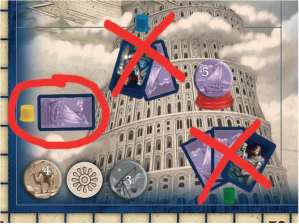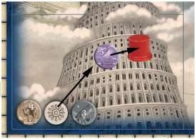The red player places his column on the Tower of Babel and takes the building disc showing 5 ships.