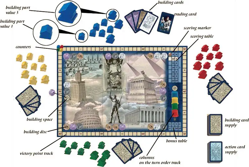 The players build together the 8 wonders of the ancient world. Each player tries to have the most building parts in a completed project and as many building discs as possible as both earn the player victory points.