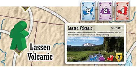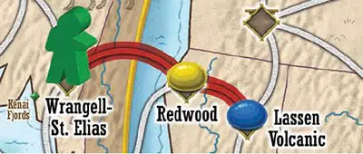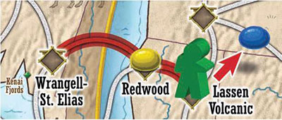 The green Trekker in the previous example is a distance of 2 away from Lassen Volcanic. To make this trip he can use one '2' Trek card, or combine two '1' Trek cards.