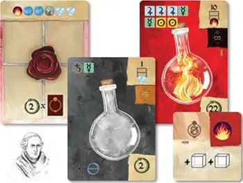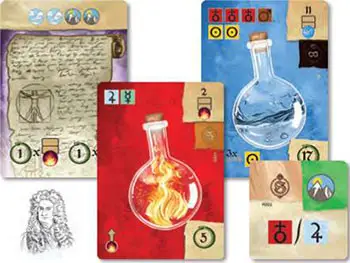 First, locate the following Laboratory boards: Claude Duval, Isaac Newton, Heinrich Cornelius Agrippa, and Roger Bacon. Alchemist components can be identified by depictions of their faces, as seen in points 1-4 below.