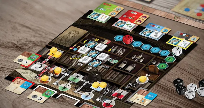 The second player should receive the Newton Laboratory board, as well as the following cards and Artifact. That player places one of their larger discs on the 2nd position of the Current Round Order track and gains 1 Ethereal die token.