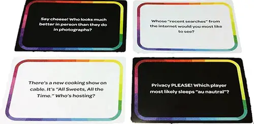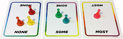 Players now turn in all their voting cards (make sure that you don't let the others see which of your cards are missing since this would give away your vote). Each player then receives a full set of voting cards. The next player takes a question card, turns it over, and reads the question aloud.