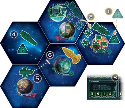 Transported ground forces and fighters move to the active system along with the ship that is transporting them. These units must remain with the ship in the space area, though ground forces may be able to land on planets during the invasion step.