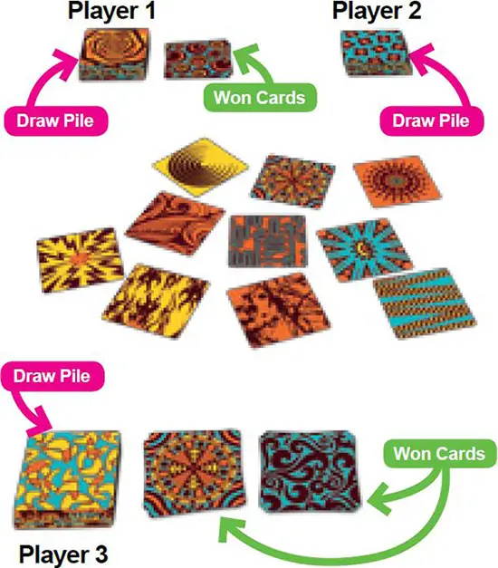 When games are played consecutively, the player who has just won takes 3 cards with different patterns and places them next to their draw pile.