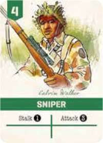 Sniper are expert riflemen and effective infiltrators. This card has the highest attack and defense value in the game and is able to move through areas not yet scouted, making it an excellent unit for taking out important enemy targets.