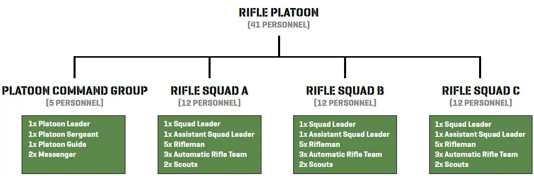 Each squad consisted of twelve men: a squad leader, an assistant squad leader, five riflemen, two scouts, and an automatic rifle team of three men. In the game, the role of the assistant squad leader has been incorporated into the Squad Leader card.