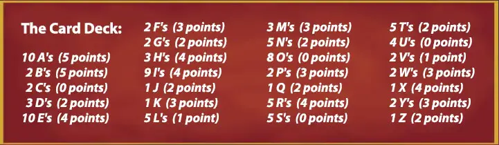 Score the word by adding the numbers on the cards. Each card's value is determined by the number of angles that the letter contains (so a "C" is worth 0 points and a "A" is worth 5).