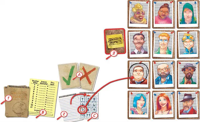 Unusual Suspects is a cooperative party game: the players win or lose together! One player will take on the role of the Witness, while the others will be the Detectives. The Witness is the only one who knows the identity of the thief.