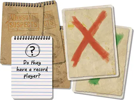 The Detectives, working together, decide to eliminate 3 Suspects who, in their opinion, own a record player, and turn those Suspect cards face down. None of them is the Guilty Party, so they write down their points on the Investigation Pad.