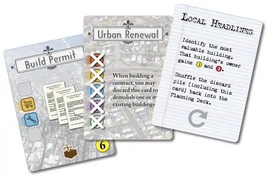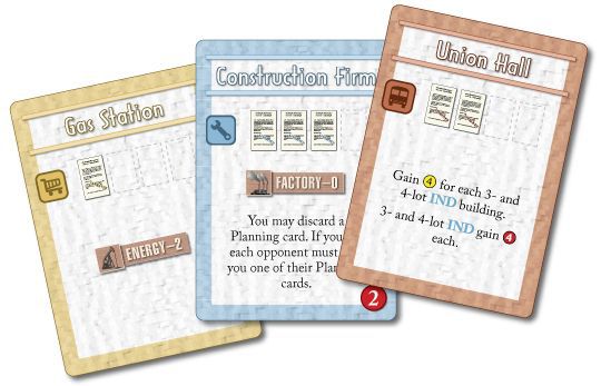 Urban Renewal Cards: There are four Urban Renewal cards in the Planning deck. These begin the game in the discard pile and thus only come into play after the first reshuffle of the Planning deck.