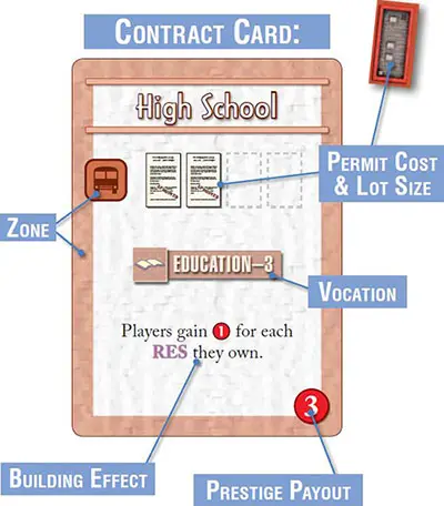 Building Contract Cards: The majority of the three contract decks are made up of "building contract" cards-or just "contracts". Each contract card is one of the four zones: CIV, COM, IND or RES, as indicated by the zone icon on the left side of the card as well as the card's colored border.