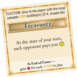Bonus: When the game ends, the Treasurer gains 1 prestige for each COM building in play (regardless of ownership).