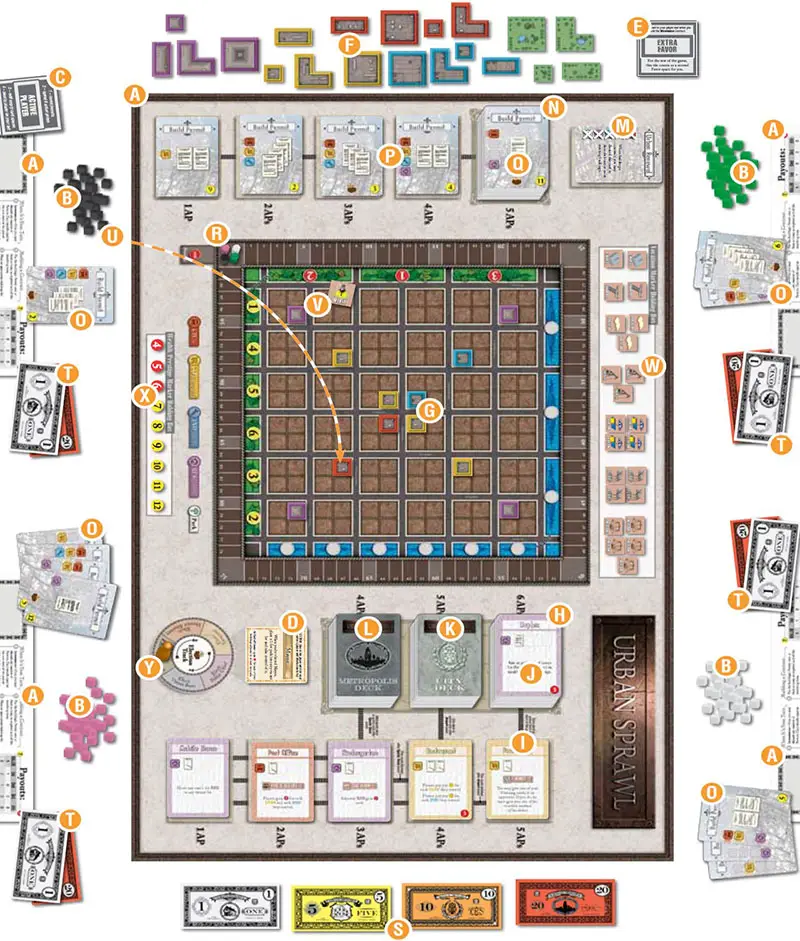 Urban Sprawl is a board game for 2-4 players. Urban Sprawl abstractly models the growth of a town into a thriving city into a teeming metropolis.