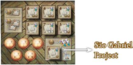 Place 7 new projects (with the Project side face up) in the Purchase Projects Area drawing them from the lowest value deck placed beside the board (the Project on top of the deck must be placed in the Sao Gabriel Project space within the square, the other 6 Projects in the 6 upper spaces).