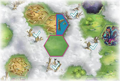 Example : Black decides to explore a fog space. He takes a meadow tile from his board and must place it on a fog space. In the example below, he may cover any space marked with a tick, as they are all either adjacent to a space he occupies or adjacent to an empty meadow space.