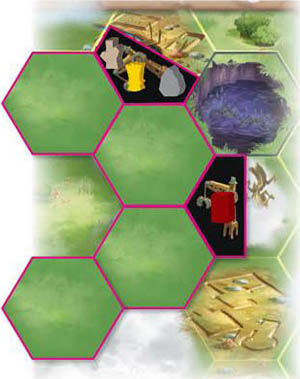 Example : White decides to transport a resource. He takes a Wheat from the Blue exploitation and delivers it to his own building site following an uninterrupted path of empty spaces. Since he has taken the last Wheat of the eploitation, Blue retrieves her craftsman.