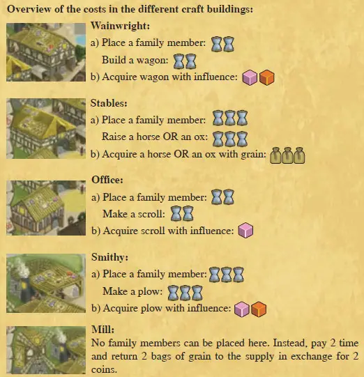Note: Family members may only produce the good of the craft buildings they are placed onto. (A blacksmith can only produce plows, not scrolls). There is no limit to how many family members, regardless of colors, may be on any building. (Exception: Players may not place family members onto the mill).
