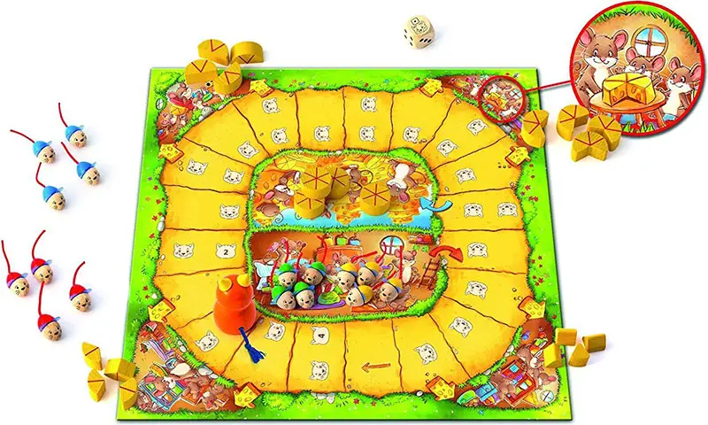 The further a mouse travels around the board, the bigger the pieces of cheese and when they succeed in arriving in paradise their perseverance is rewarded with a whole cheese with 6 slices.