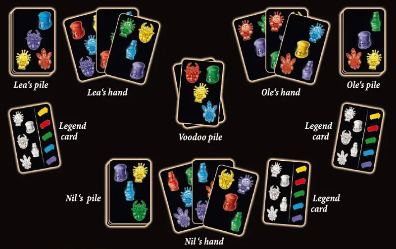 Shuffle the ingredient cards and place one ingredient card in the middle of the table well within everyone's reach. This will be the Voodoo pile. Then, deal out the remaining ingredient cards evenly among the players: