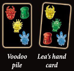 Then, he picks up the top card from his own pile of ingredient cards and adds it to his hand; the game continues on without any stops. Now there's a different ingredient card atop the Voodoo pile, and with it, a new combination of ingredients and color to find.