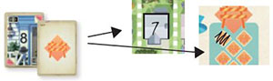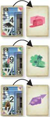 At the beginning of each turn, flip over the top card of each construction stack and place it to the right with its effect displayed. These stacks create three combinations, comprised of a House Number and an Effect. These combinations are used to perform actions.