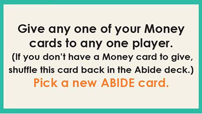 Shuffle and place the deck of Money cards facedown in the middle of the play area. Shuffle and place the deck of Abide cards facedown in the middle of the play area.
