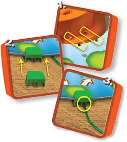 Attach the 4 game board stabilizers to the game board (see figure 2) and push the whoopee cushion controller wires into the grooves on the game board stabilizers until they are secure (see figure 3).