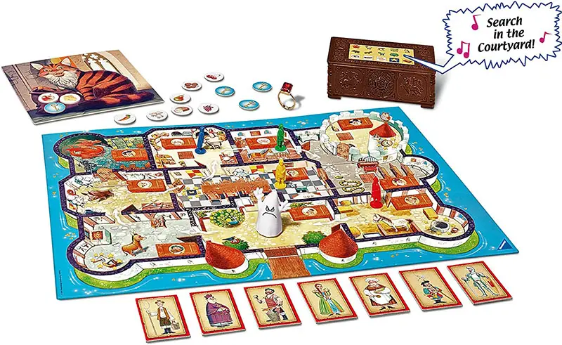 The cat, 9 food tokens, 4 key tokens, die and 10 suspect cards are placed face up beside the game board.