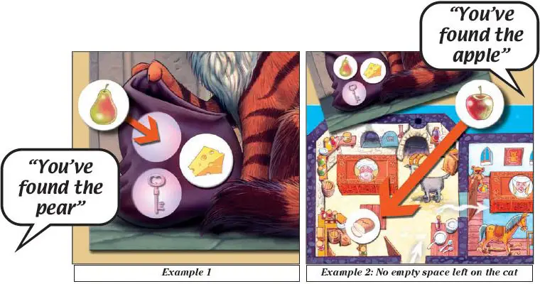 Only two food tokens can be placed on the cat at one time. After that, place any additional food tokens in the kitchen pantry (Example 2).