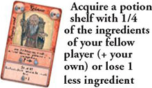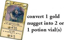 Fortune teller: the player with the full action right, can trade one of his gold nuggets for two potion vials (which he may "hide" under his potion cards).