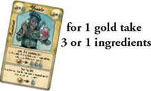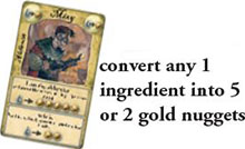 Thus, he places any one of the drops from his play area back into the supply and takes from the supply 5 gold nuggets, placing them in his play area. The player(s) who choose the favor of the Alchemist, can convert any one ingredient into two gold nuggets.