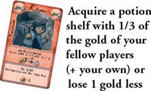 After all his fellow players have been relieved of their gold nuggets, the cutpurse may choose to place one or more gold nuggets from his play area onto the top-most gold potion shelf card.