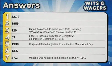 Players (or teams) take back their Wits Answer Cards. The Question Reader places the used Question Card blue-side-up next to the remaining Question Cards.