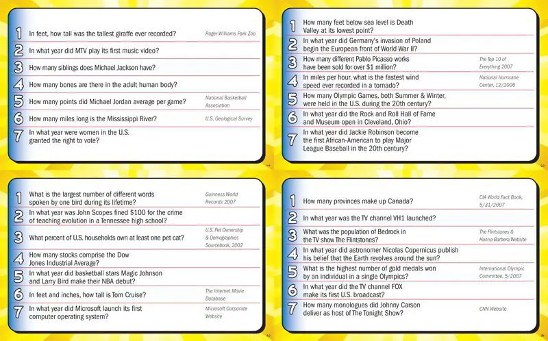 Choose a player to be the Question Reader. Give the Question Reader 7 Question Cards. The Question Reader also plays in the game (So don't look at the answers on the back!)