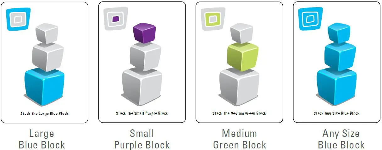 If you play a block stacking card, you must then add a matching block to the top of the tower. If a tower does not yet exist, simply place the block in the center of the play area to start a new tower. You can only play a particular card if there is a matching block available to be added to the tower.