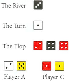 The Dealer then rolls the Flop, Turn and River community dice (a total of five dice). As the dice are rolled, players try for the best possible five-dice hand,