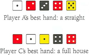 The River was a lucky roll for Player A; she now has a 1-through- 5 straight! She only bets 10, hoping that Player C will "sweeten the pot" by betting more. Player C, with a full house, calls her bet. The round is over.