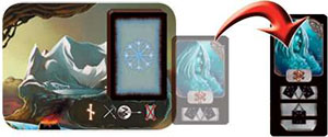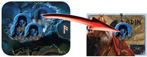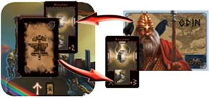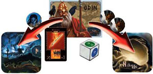 Odin is fighting the Giant Gialp who prevents the Gods from performing actions on the Kingdom of Fire. He wins the combat with a force of 3. He discards Gialp who has the thirdpart of the DaegRune. With Gialp's defeat, the Kingdom of Fire is accessible again.