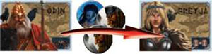 Take, give, or exchange Elves and/or Vikings with one other God only.