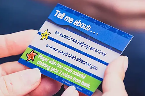 Storyteller chooses a question from the next question card and reads it to the player to his/her right who becomes the new Storyteller.